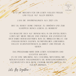 Wir treffen uns an 4 Terminen live - Wenn du an unserem Live- Termin nicht direkt dabei sein kannst, dann hast du immer die Chance das Video im Nachhinein anzuschauen. In deinem Tempo.1x in der Woche gibt es eine Yogaeinheit, um mehr ins Spüren zu kommen und die Energie fließen zu lassen.