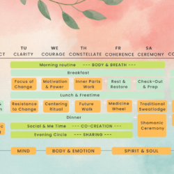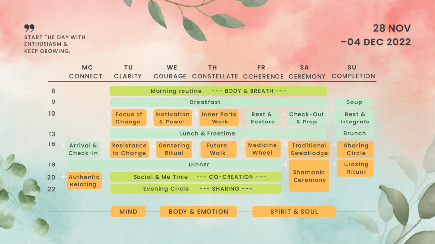 DAY 1Â Arrival & Connection with the retreat group.DAY 2Â Orientation on status quo in your different areas of life. Gain clarity on your values as a source.