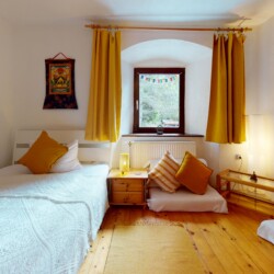 - Bett im geteilten Dreibettzimmer (inkl. vegetarischer Vollpension & Kurtaxe): 270 € (Einmalige Kosten)