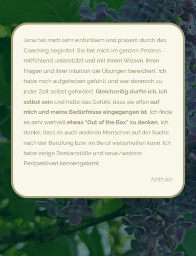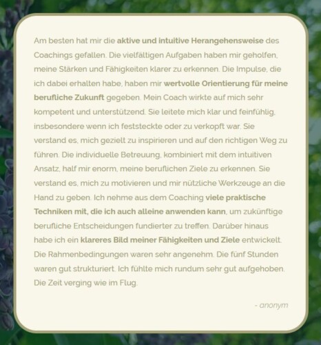Das Vorgehen ist spielerisch und bezieht Dein Gefühl und Deine innere Stimme mit ein. Am Ende des rund fünfstündigen Coachings fügt sich alles zu einem Gesamtbild zusammen, mit dem Du Dich auf den Weg zu einem selbstbestimmten und glücklichen Leben machen kannst.