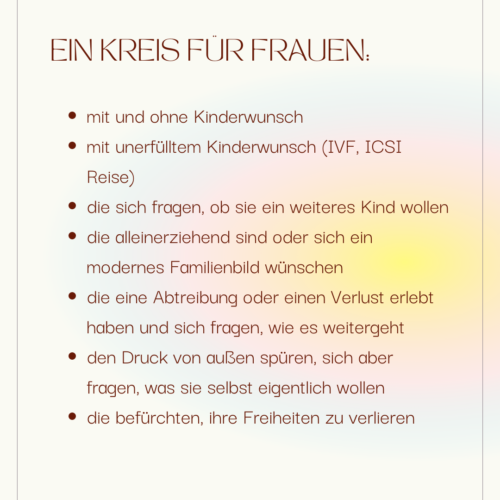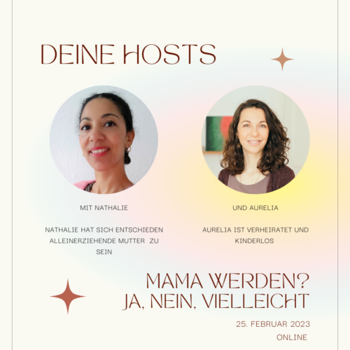WEITERE INFOsDeine Hosts für diesen Frauenkreis sind Nathalie von MokshaYou und Aurelia. Nathalie hat im Sommer einen Sohn zur Welt gebracht und Aurelia beschäftigt sich seit mehreren Jahren mit dem Thema Kinderwunsch.