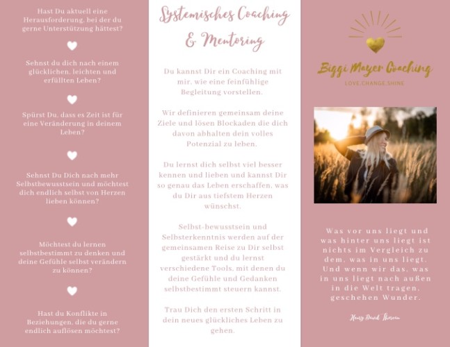 Als ausgebildeter und zertifizierter systemischer Coach begleite ich dich bei privaten als auch beruflichen Herausforderungen. Wir erarbeiten durch verschiedene Tools und Fragetechniken, die Lösungen für all deine Herausforderungen. Du trägst alles bereits in Dir, du musst es bloß wieder entdecken. Ich bin ein sehr feinfühliger, herzlicher Mensch der dir auf Augenhöhe begegnet und Dich dabei begleitet Dir das Leben zu erschaffen was du Dir aus tiefstem Herzen wünschst.