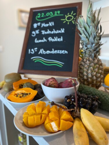 - Wasser, Tee und Obst – jederzeit frei verfügbar