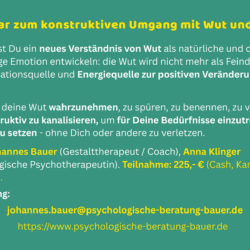 Du lernst, deine Wut wahrzunehmen, zu spüren, zu benennen, zu verstehen und konstruktiv einzusetzen, um für Deine Bedürfnisse einzutreten und Grenzen zu setzen – ohne Dich oder andere zu verletzen.