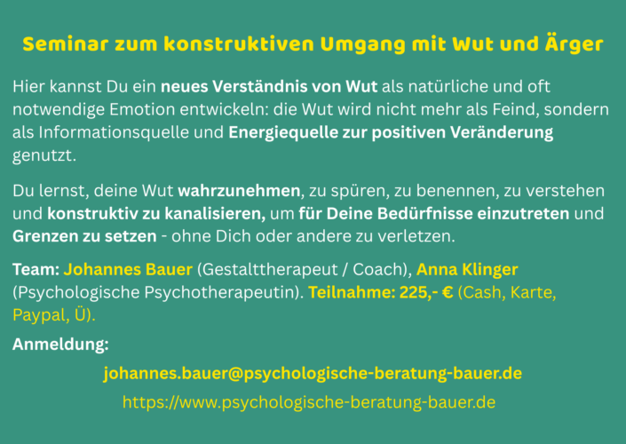 Dabei wirst du – vielleicht zum ersten Mal – mit deinen Gefühlen gesehen, wahrgenommen und akzeptiert; du wirst handlungsfähig und gestaltest den Umgang mit deiner Wut.