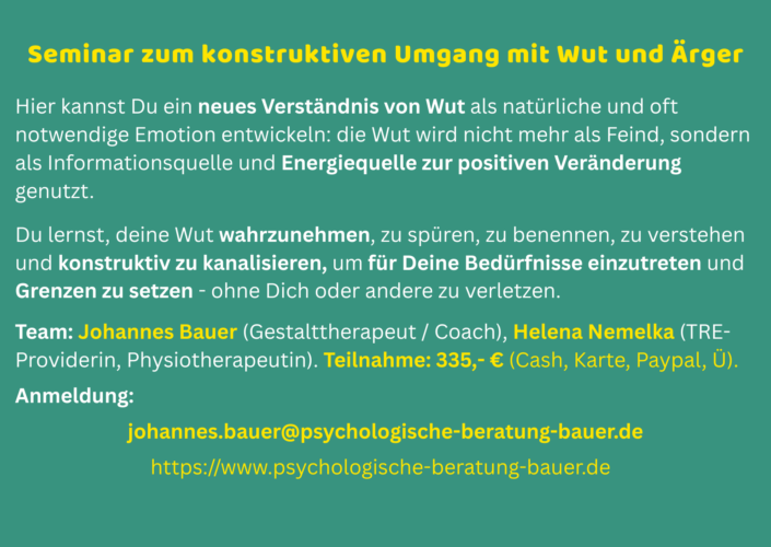 Hier kannst Du ein neues Verständnis von Wut als natürliche und oft notwendige Emotion entwickeln: die Wut wird nicht mehr als Feind, sondern als Informationsquelle und Energiequelle zur positiven Veränderung genutzt.