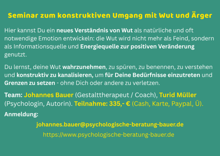 Hier kannst Du ein neues Verständnis von Wut als natürliche und oft notwendige Emotion entwickeln: die Wut wird nicht mehr als Feind, sondern als Informationsquelle und Energiequelle zur positiven Veränderung genutzt.